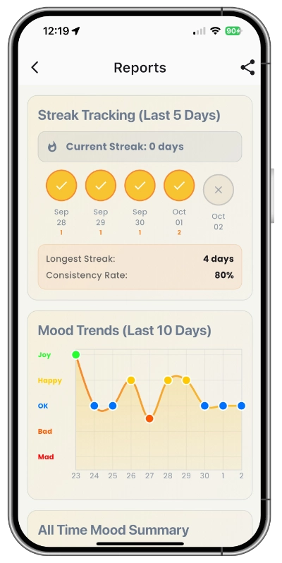 Monitor your moods to uncover emotional trends, recognize triggers, and build greater self-awareness over time.